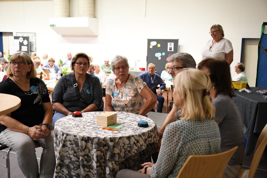 Dummerweise saß ich mit dem Rücken zur Bühne und habe nicht alle Fotos und Videos von den verschiedenen Gruppen gesehen, die während des Essens gezeigt wurden. Aber ein paar Highlights habe ich doch mitbekommen. Das Kreuzworträtsel mit Fragen zu Gelsenkirchen und zu ZWAR-Aktivitäten war nicht ohne die Zusammenarbeit am Tisch zu lösen.