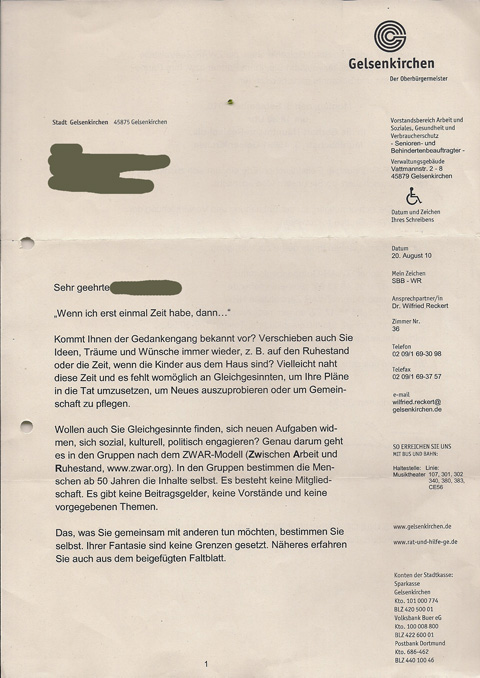 Seine Brüder und er wurden nur bestimmten Haushalten zugeschickt. Mitbürger*innen des Stadtteils Gelsenkirchen-Erle über 50 Jahre waren auserwählt. Nicht in jeder Familie machte der kleine Brief Freude.