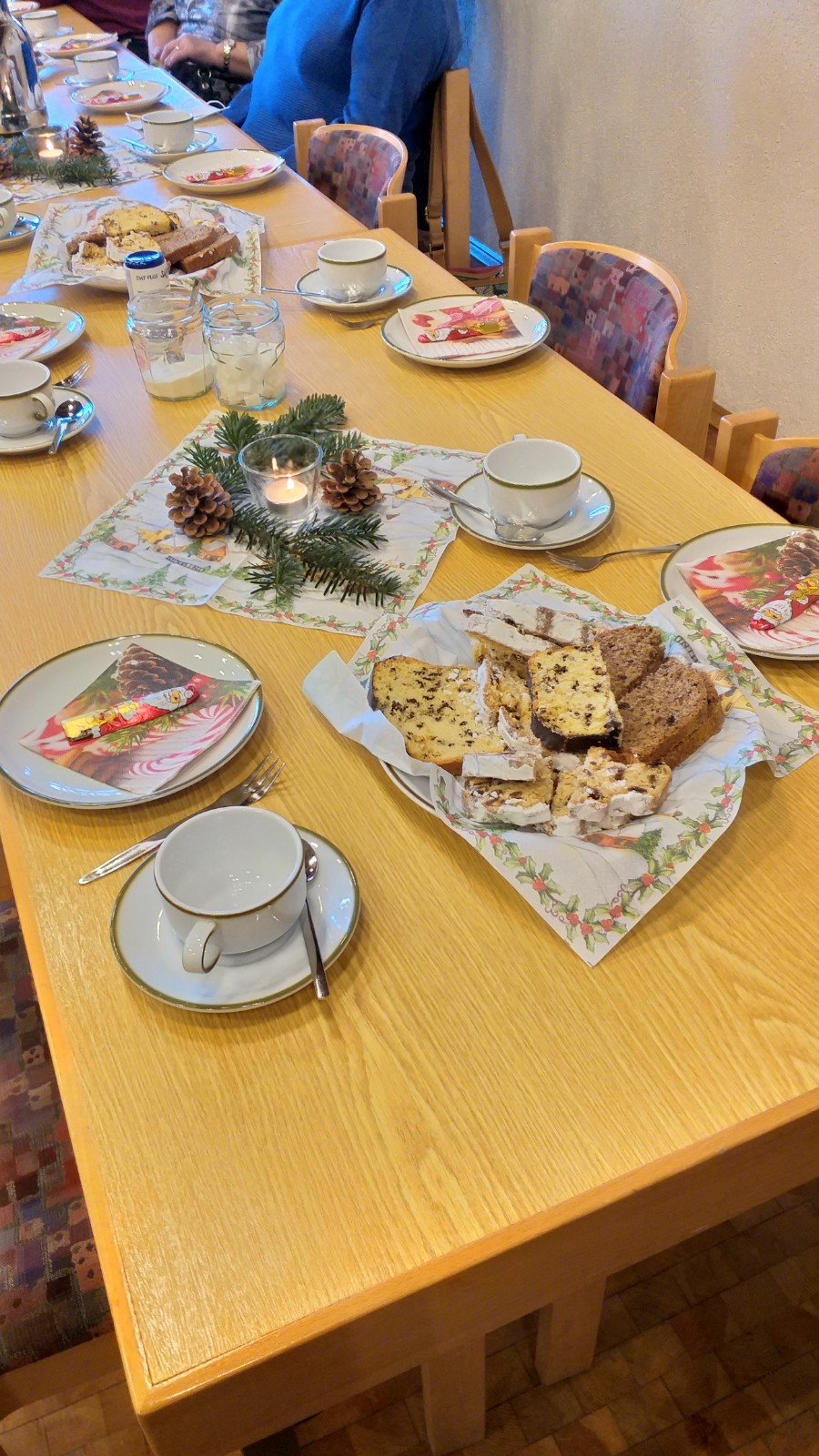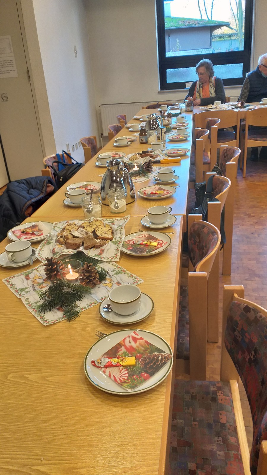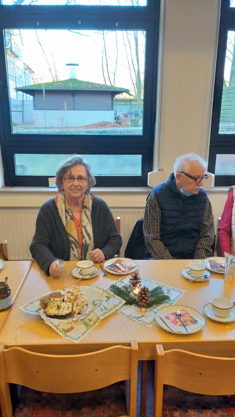 Letztes Jahr musste unsere Weihnachtsfeier leider wegen CORONA ausfallen. In diesem Jahr war es anders, alle waren geimpft und geboostert. Jetzt konnten wir starten: Die Tische wurden mit Kerzen, Servietten und Zapfen geschmückt. Wir haben Kaffee getrunken, Kuchen gegessen, Gedichte und Weihnachtsgeschichten vorgelesen und natürlich "gequatscht", das war besonders wichtig. Es war ein schöner Nachmittag. Hoffen wir, dass wir uns im neuen Jahr zufrieden und gesund wiedersehen.